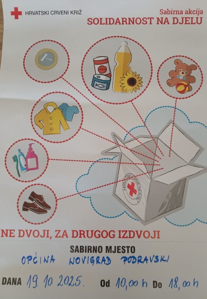 U nedjelju 19. listopada 2025. godine, od 10:00 do 18:00 sati, učenici OŠ “Prof. Blaž Mađer” će obilaziti domove na području Općine Novigrad Podravski i prikupljati dobrovoljne priloge za humanitarnu akciju “Solidarnost na djelu”.