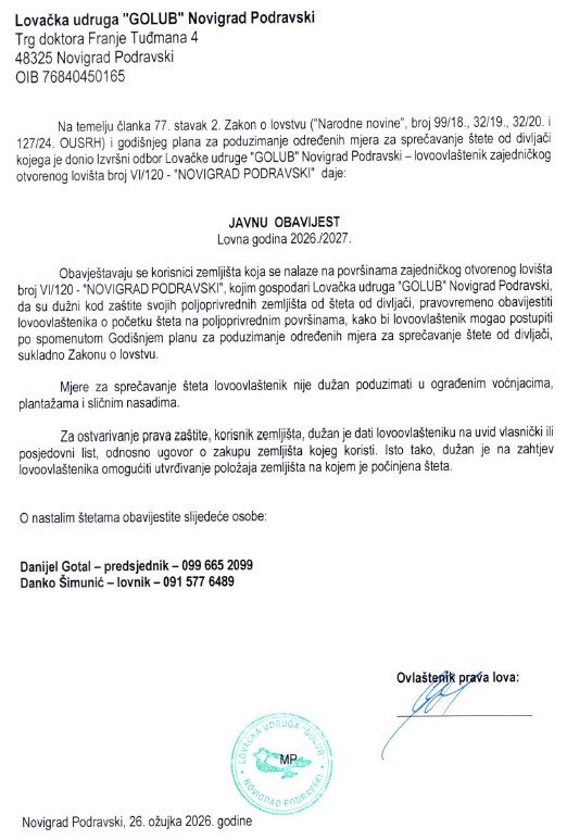 Obavještavaju se korisnici zemljišta koja se nalaze na površinama zajedničkog otvorenog lovišta broj VI/120 – NOVIGRAD PODRAVSKI, kojim gospodari Lovačka udruga “Golub” Novigrad Podravski, da su dužni kod zaštite svojih poljoprivrednih zemljišta od šteta od divljači, pravovremeno obavijestiti lovoovlaštenika o početku šteta na poljoprivrednim površinama, kako bi lovoovlaštenik mogao postupiti po spomenutom Godišnjem planu za poduzimanje određenih mjera za sprečavanje štete od divljači, sukladno Zakonu o lovstvu.