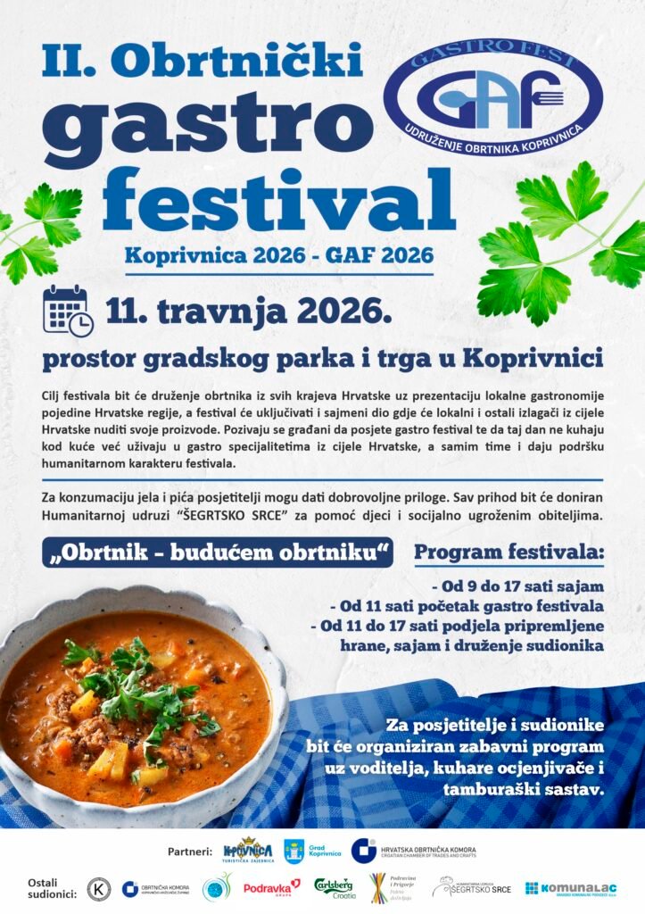 Udruženje obrtnika Koprivnica u partnerstvu s Turističkom zajednicom grada Koprivnice, Gradom Koprivnica, Hrvatskom obrtničkom komorom te uz podršku Obrtničke komore Koprivničko-križevačke županije organizira II. Obrtnički gastro festival Koprivnica 2026 – GAF 2026, koji će se održati 11. travnja 2026. godine na prostoru gradskog parka i trga u Koprivnici.