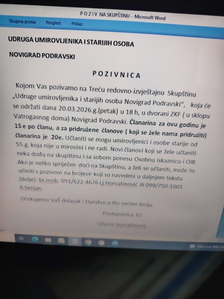 Treća redovna izvještajna Skuština Udruge umirovljenika i starijih osoba Novigrad Podravski održat će se u petak 20.3.2026. u 18 sati u dvorani ZKF. Pozivaju se članovi da dođu u što većem broju.