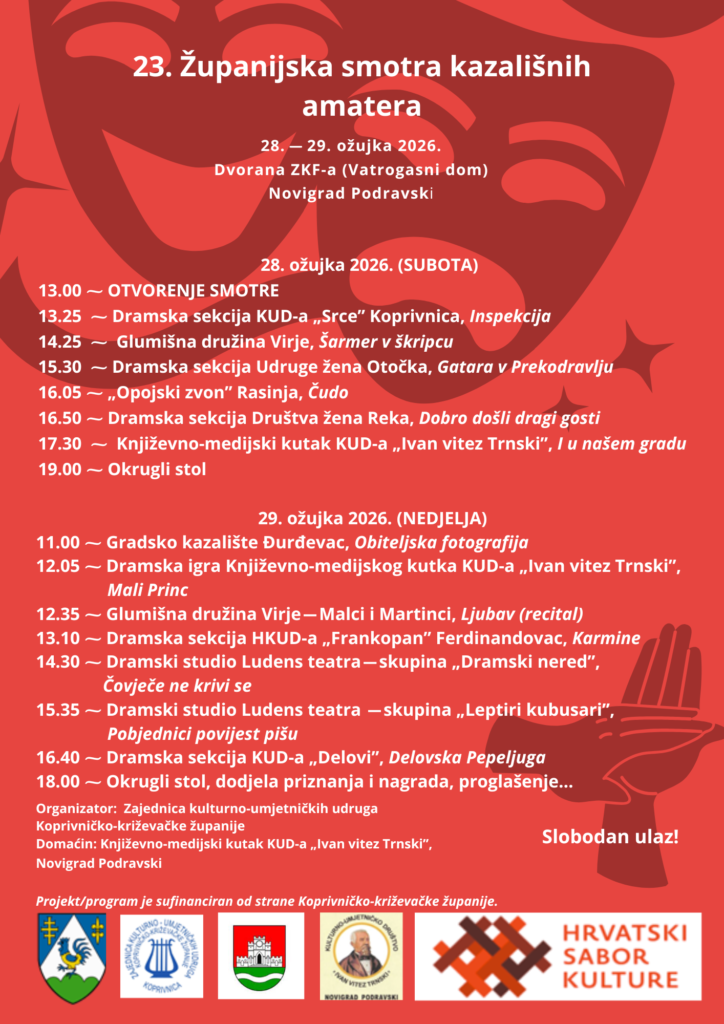 Zajednica kulturno-umjetničkih udruga Koprivničko-križevačke županije poziva vas na Županijsku smotru kazališnih amatera u Novigradu Podravskom, u dvorani ZKF-a (Vatrogasni dom), u subotu 28. ožujka 2026. i nedjelju 29. ožujka 2026.!